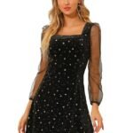 Allegra K Women’s Mesh Sheer Puff Long Sleeve Square Neck Glitter Star Mini Velvet Dress