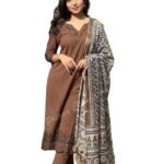 ROYAL ARTSY Women Pure Cotton Brown Kurti Pant Dupatta Set