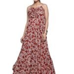Varanga Women Red Abstract Printed,Spaghetti Strap Cowl Neck A-Line Floor Length Dress, Flared Hem